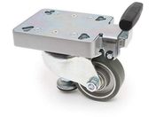 アジャスターの機能を備えたキャスターです。レバーのワンタッチ操作にてアジャスターの設置と解除が可能です。レバーが常に筐体の外側に位置しているので、固定時にキャスターを回す必要がありません。帯電防止機能があります。