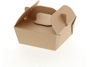 ナチュラルなクラフトテイストの食品箱です。持ち手付きでテイクアウトにも使いやすく便利です。PBTラミネート加工がされているため、油分の多い食品にも対応できます。成型された状態で包装された商品です。※食品の長期保存には適しません。