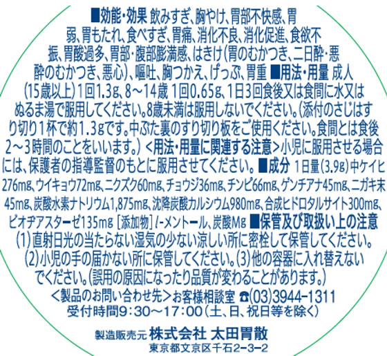 生薬特有の芳香味と効きめを生かすようにしております。弱った胃を元気にし、飲みすぎや胃もたれなどの胃の不快な症状や食欲不振を改善します。