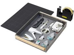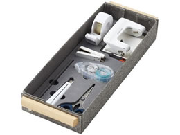 共用文具の消耗品と、消耗品が中箱のままきれいに収納できるトレーのセット