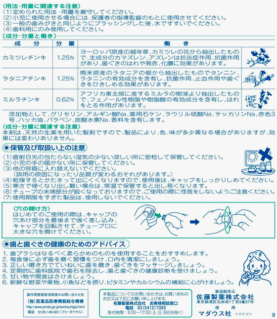 ●カミツレ、ラタニア、ミルラを配合。歯ソーノーロー、歯肉炎の原因となる「嫌気性菌」にすぐれた抗菌力を発揮して、歯ぐきの出血、はれ、口臭などをしずめます。
