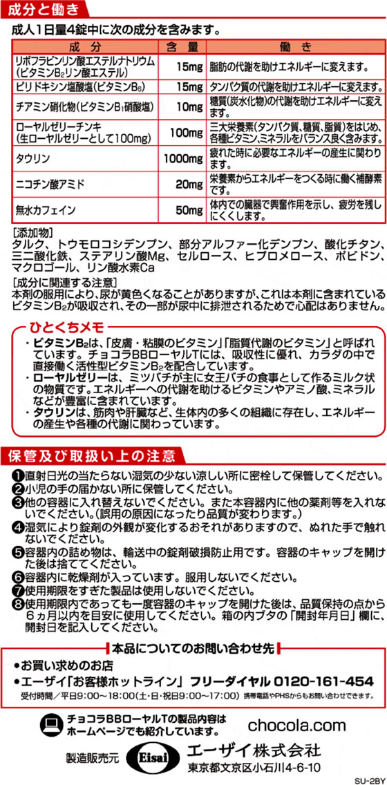 チョコラBBローヤルTには、脂肪の代謝を助けエネルギーにかえるビタミンB2に加え、ローヤルゼリー、タウリンなど、エネルギーづくりに働く成分を効果的に配合しています。
