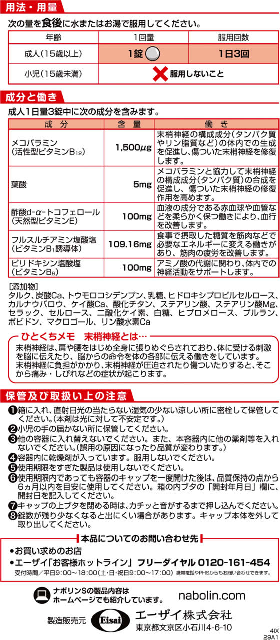 ナボリンSには、筋肉疲労に効果のあるビタミンB1、血行不良を改善するビタミンE、末梢神経のキズを修復する活性型ビタミンB12(メコバラミン)が含まれています。また、メコバラミンの働きを強化する葉酸も配合し、“もんでも届かないコリ”として感じる肩こり、腰痛によく効きます。