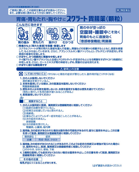 スクラルファートが胃の荒れた患部を選んで吸着し、胃酸などの攻撃から保護するとともに、患部を修復して、もとから治していきます。さらに、アズレンスルホン酸ナトリウムとL−グルタミンが炎症をしずめ患部の修復を促進します。