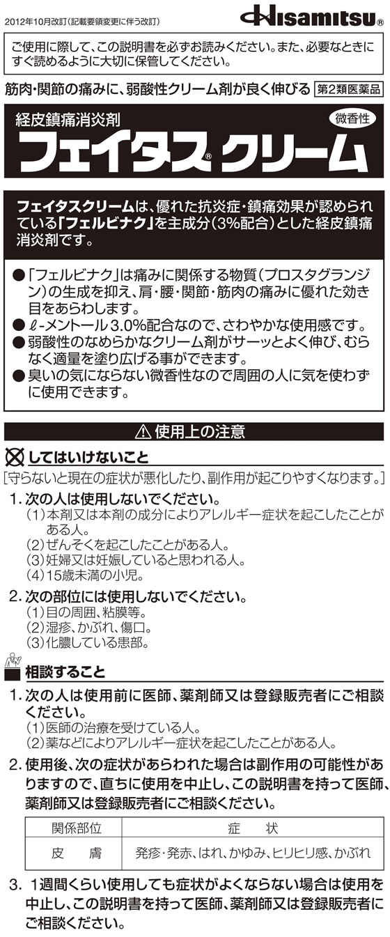 ●フェイタスクリームは、優れた抗炎症・鎮痛効果が認められている「フェルビナク」を主成分(3%配合)とした経皮鎮痛消炎剤です。