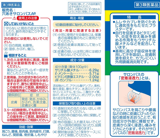 ●穴あきサロンパスAeは、基剤に高分子吸収体を使用して汗を吸収し、皮ふ刺激を抑えた、カブレにくい外用鎮痛消炎剤です。