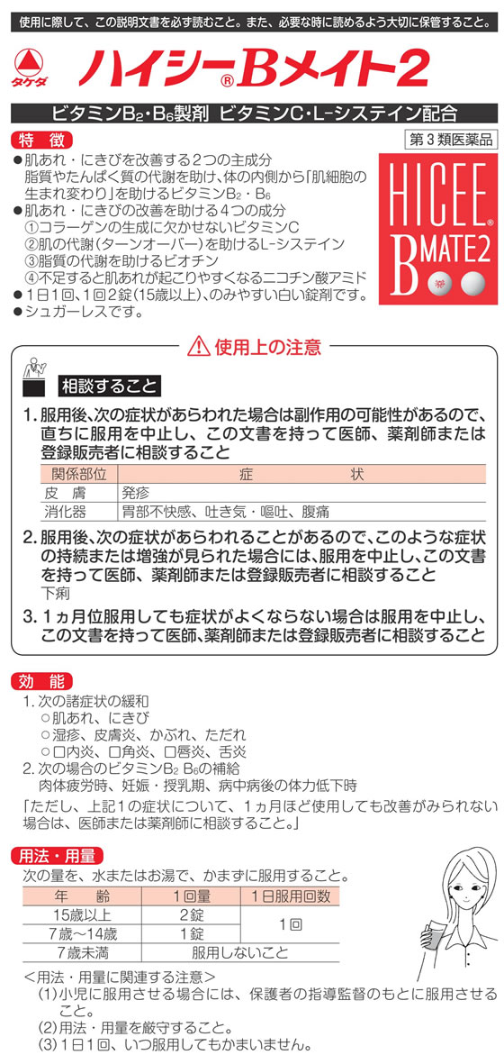 ●肌あれ・にきびを改善する2つの主成分脂質やたんぱく質の代謝を助け、体の内側から「肌細胞の生まれ変わり」を助けるビタミンB2・B6●肌あれ・にきびの改善を助ける4つの成分(1)コラーゲンの生成に欠かせないビタミンC(2)肌の代謝(ターンオーバー)を助けるLーシステイン(3)脂質の代謝を助けるビオチン(4)不足すると肌あれが起こりやすくなるニコチン酸アミド●1日1回、1回2錠(15歳以上)、のみやすい白い錠剤です