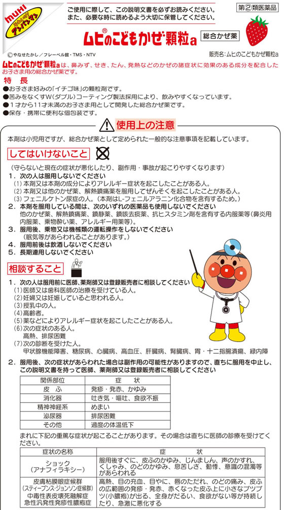 ムヒのこどもかぜ顆粒は、鼻みず、せき、たん、発熱などのかぜの諸症状に効果のある成分を配合したお子さま用の総合かぜ薬です。