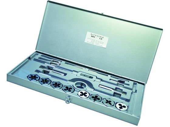 ●中タップ:M6×1.0/M8×1.25/M10×1.25/M12×1.25・M12×1.5/M14×1.5/M16×1.5/M18×1.5 各1本●ダイス38径:M6×1.0/M8×1.25/M10×1.25/M12×1.25・M12×1.5/M14×1.5/M16×1.5/M18×1.5 各1個●タップハンドル20mm/ダイスハンドル38径 各1本 合計18点