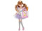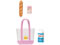 キラキラのパープルドレスに大きなトートバッグ、スマートフォン、パン、牛乳がセットになっています。