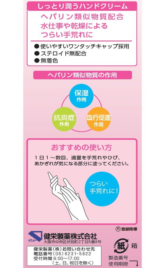 手指の荒れ、ひじ・ひざ・かかと・くるぶしの角化症、手足のひび・あかぎれ、乾皮症、小児の乾燥性皮ふ、しもやけ(ただれを除く)、きず・やけどのあとの皮ふのしこり・つっぱり(顔面を除く)、打身・ねんざ後のはれ・筋肉痛・関節痛