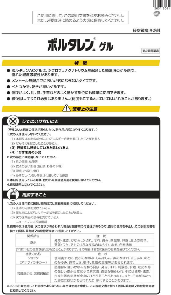 ●ボルタレンACゲルは、ジクロフェナクナトリウムを配合した鎮痛消炎ゲル剤で、優れた経皮吸収性があります。