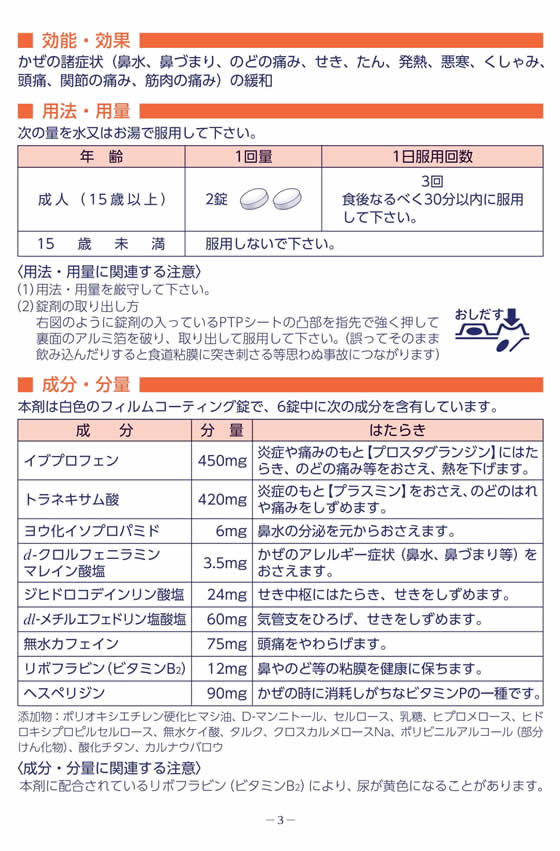 ●抗ヒスタミン成分d−クロルフェニラミンマレイン酸塩が、かぜのアレルギー症状(鼻水・鼻づまり)をおさえ、ヨウ化イソプロパミドが鼻水の分泌を元からおさえます。